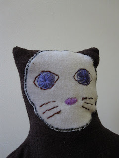 Sen lisäksi aion edistää lapsen kasvamista kissaihmiseksi ja käsityön arvostajaksi tällä pehmolla. Kankaat on muuten lapsen äidin lapsuudesta. Toivottavasti en aiheuta traumoja. (sillä on häntäkin, ja pitkä onkin, mutta ei silti näy kuvissa)